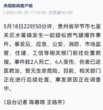 据央视新闻音讯,2024年5月18日22时50分许,贵州省毕节市七星关区水箐镇产生一同疑似燃气罐爆破事件,导致2人逝世,4人受伤,伤者已送医救治,暂无生命危险。