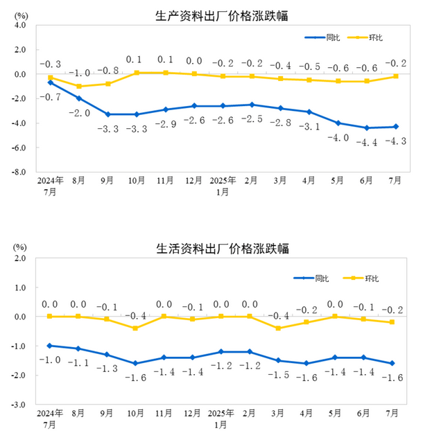 2025年7月份,全国工业生产者出厂价格环比下降0.2%,工业生产者进价环比下降0.3%,降幅比上月分别收窄0.2个和0.4个百分点。工业生产者出厂价格同比下降3.6%,工业生产者进价同比下降4.5%。17月平均,工业生产者出厂价格比上年同期下降2.9%,工业生产者进价下降3.2%。