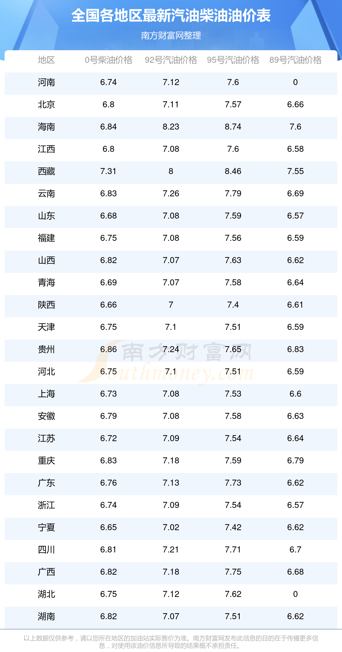以上数据仅供参考,请以您所在地区的加油站实际售价为准。南方财富网发布此信息的目的是传播更多详细的信息,对使用该油价信息所导致的结果概不承担责任。